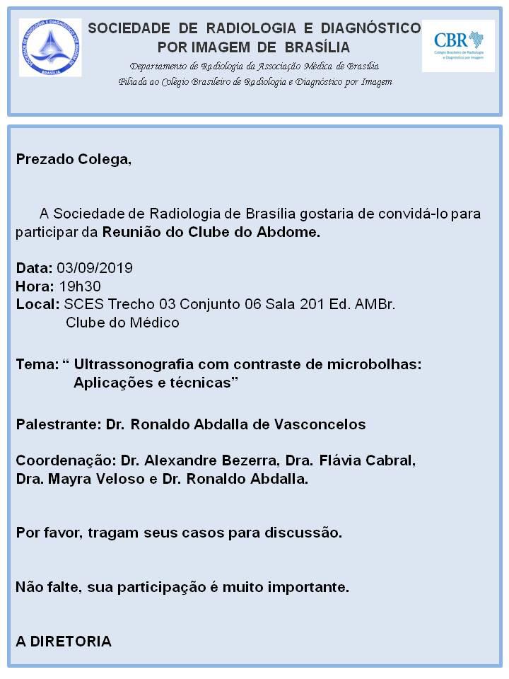 No próximo dia 03/09, o Dr. Ronaldo fará uma aula na Sociedade de Radiologia de Brasilia na sede da Associação Médica sobre “Ultrassonografia com contraste de microbolhas”, um tema extremamente atual e importante para ser debatido e cujo uso pode auxiliar vários pacientes impossibilitados de realizar exames com os contrastes tradicionais da tomografia computadorizada e da ressonância magnética.